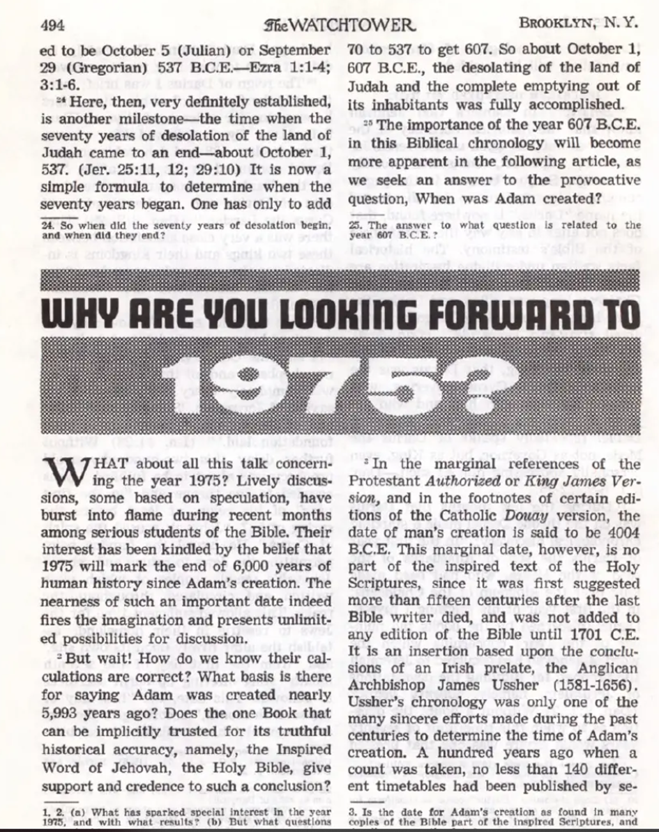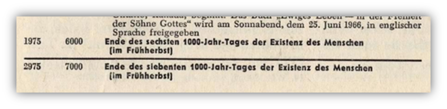 - 1972–1975: 6000 Jahre Menschheitsgeschichte enden. Beginn des Millennium erwartet. (Ewiges Leben in der Freiheit der Söhne Gottes, Wachtturm 1.8.1968, Erwachet! 9.4.1969 u. a.)