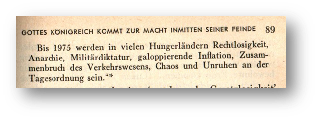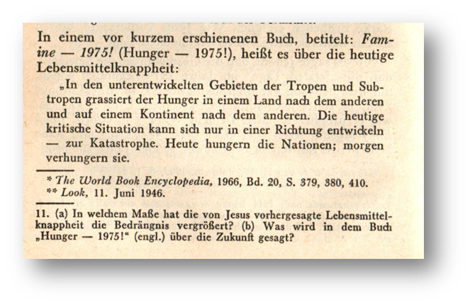 - Wachtturm 15.10.1976, S. 633: „Falls jemand enttäuscht worden ist, weil er nicht diese Einstellung hatte, sollte er sich jetzt bemühen, seine Ansicht zu ändern, und sollte erkennen, daß nicht das Wort Gottes versagt oder ihn betrogen und enttäuscht hat, sondern daß sein eigenes Verständnis auf falschen Voraussetzungen beruhte.„